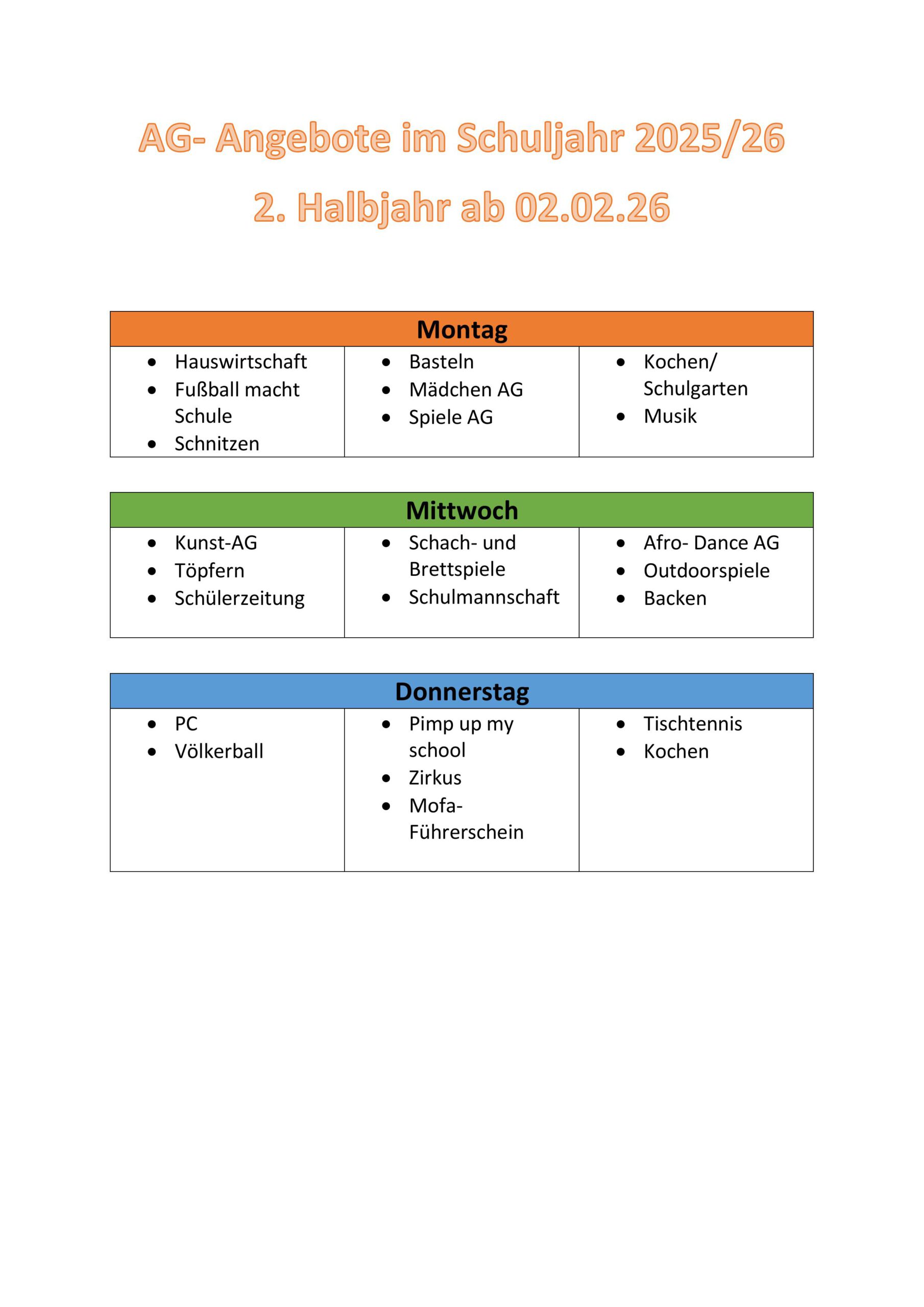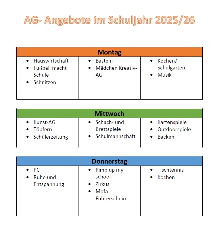 Die aktuelle Übersicht der AGs am Nachmittag im Schuljahr 2025/2026