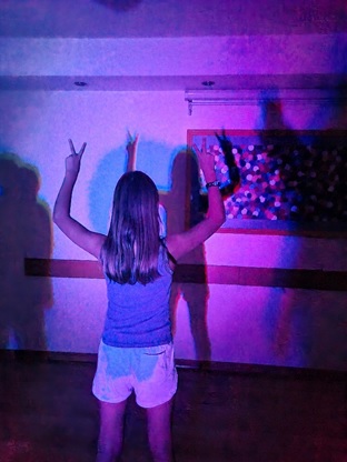 Am Abend haben wir eine Klassenparty mit lauter Musik, Lichtern, Chips und Limo gemacht. Wir haben getanzt und standen am DJ Pult.